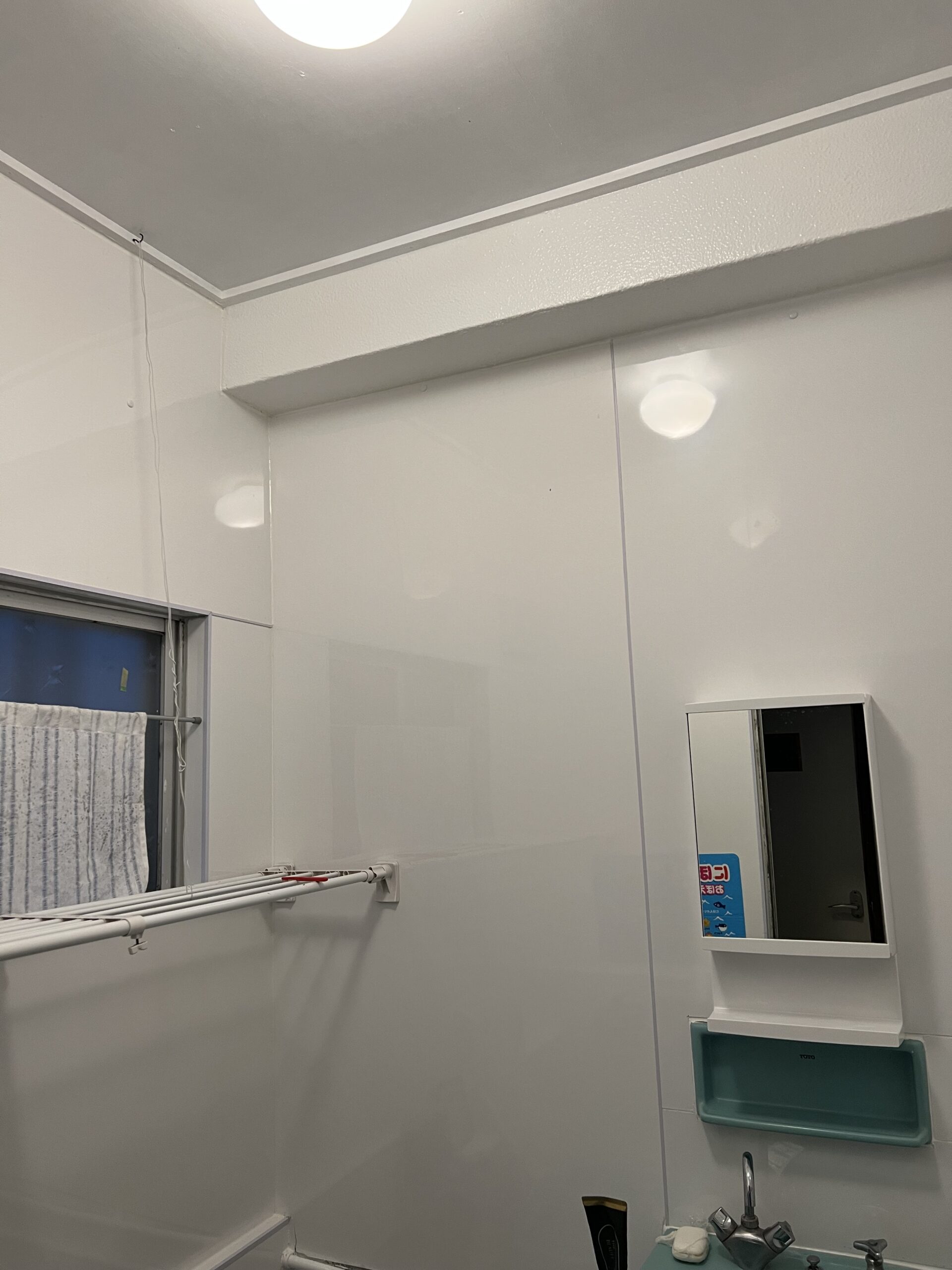 最初は浴室から触りました、壁のペンキが劣化で剥がれていたので壁にはメークマンで買ってきた木で下地組みをしキッチンパネルを張りました。浴室なので隙間にシャワーの水が行くと骨が腐れたり、カビが生えたりする恐れがあるので、コーキングも打ちました。