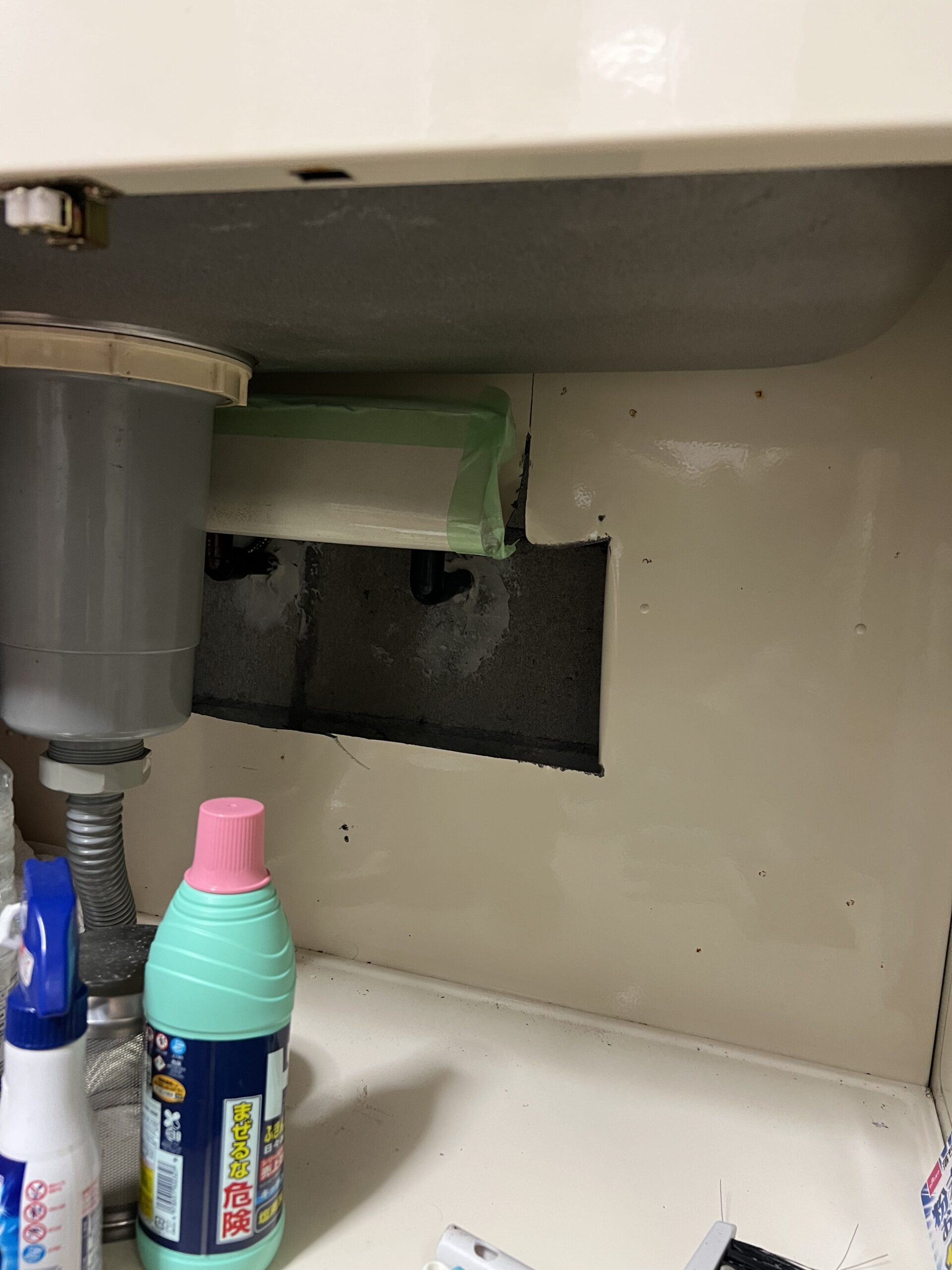 本来ならば点検口があれば、そこから手伸ばして水道パイプの根本工事できるんですが、今回なかったので、少し強引ですがキッチンの下収納にグラインダーで開口作り壁点検口作りました。